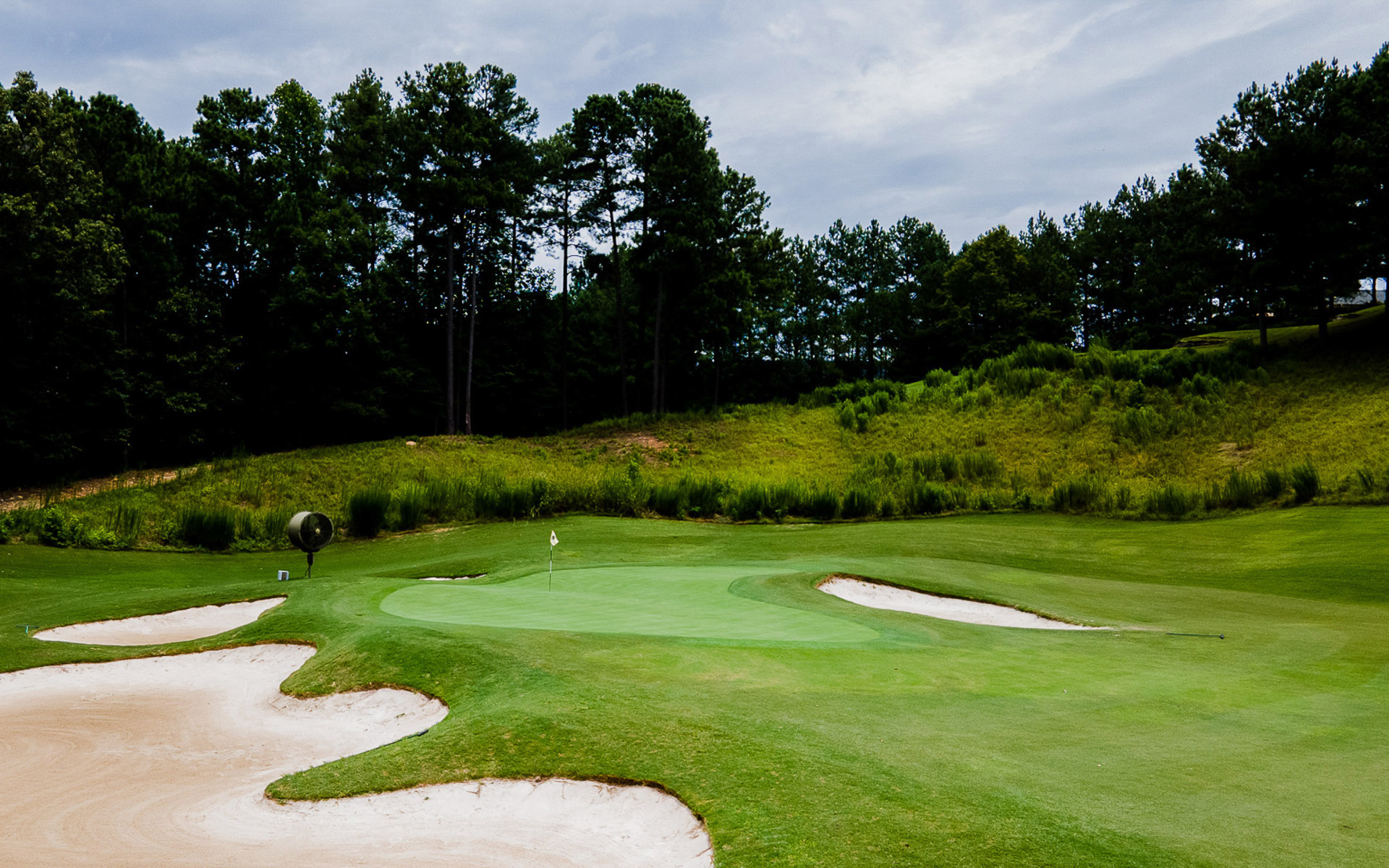 At 565 yards, No. 14 is the longest par 5 at Bear's Best Atlanta. The tee shot plays uphill to a small landing area guarded by a bunker on the right and OB left. The second shot plays downhill to a well-protected green. A large bunker crosses the fairway short of the green forcing all but the longest hitters to lay up on their second shots.