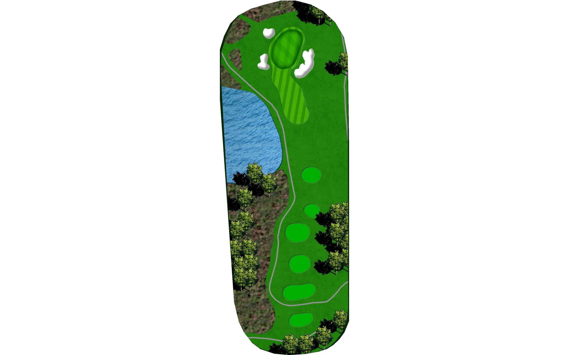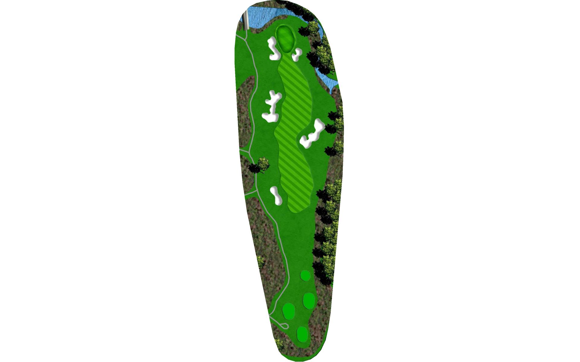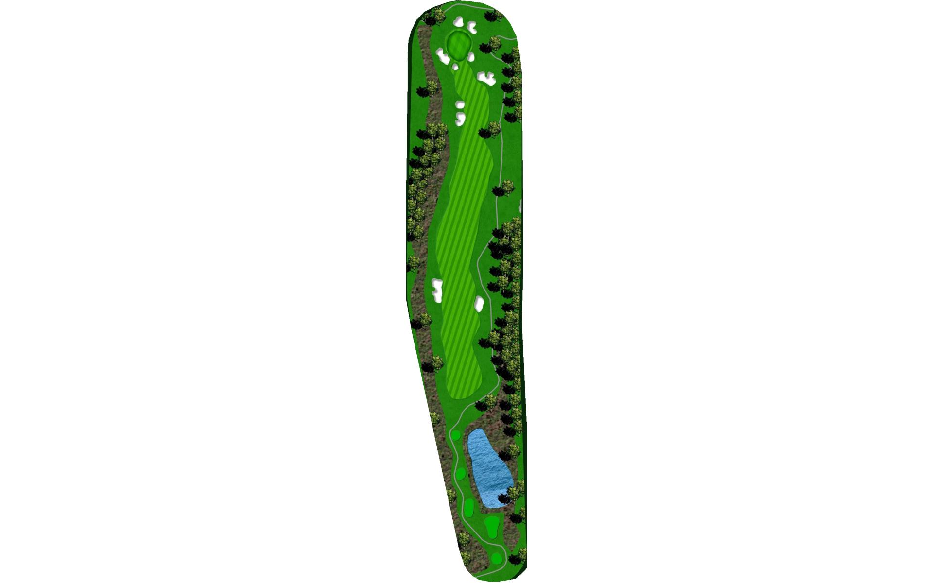The fairway on this par 4 slopes from left to right toward the lake. Stay left so your approach is not blocked by the trees on the right. …